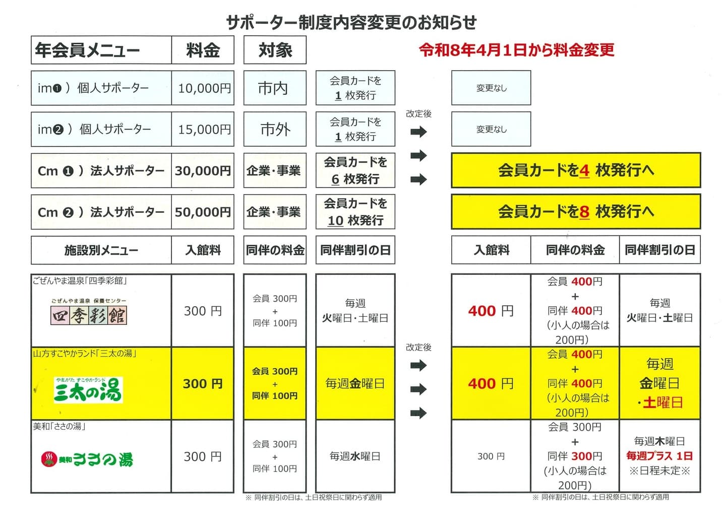 常陸大宮市温泉事業株式会社では、四季彩館、三太の湯、ささの湯の三施設にて「施設共通サポーター」を随時募集しております。市民の皆様は年間サポーター年会費10000円(市外の方は15000円)でご入会頂けます。入会特典として、全ての施設の入館料が、一律300円(2026年3月まで、2026年4月以降は400円)になる他、お食事の割引、同伴者のご招待(週1日)等、各施設ごとに様々なサービスをご用意しております。詳細は各施設にお気軽にお問合せ下さい。